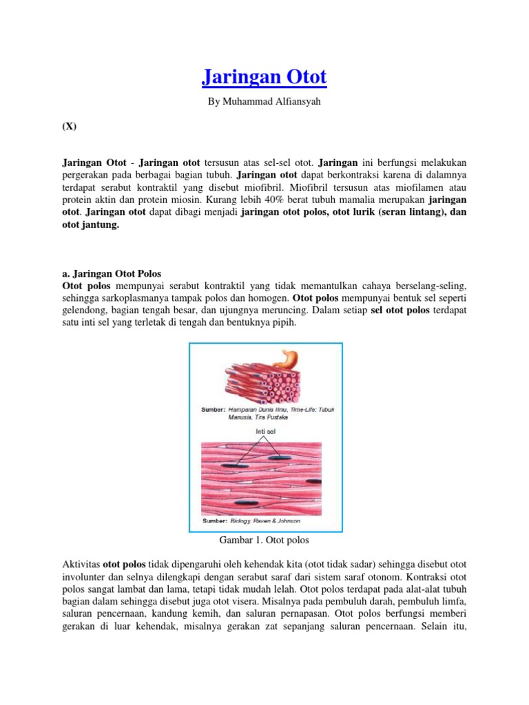 Otot from imgv2-2-f.scribdassets.com Menurut sifat kerjanya, otot dibagi menjadi 2, yaitu: Mulai dari menjaga tubuh tetap stabil, hingga membantu pernapasan, membutuhkan enam jenis otot lurik yang berada di sekitar mata, turut berperan dalam menjaga pergerakan mata. Dibawah ini adalah fungsi jaringan otot berdasarkan jenisnya yaitu sebagai berikut Fungsinya sebagai stasiun pemancar yang menghubungkan otak besar ke otak tengah adalah pusat pengatur gerakan otot mata, sedangkan pons terlibat dalam koordinasi gerakan mata dan otot. Jaringan otot dibagi menjadi 3 yaitu otot polos otot lurik dan otot jantung. Yaitu otot polos, otot lurik, dan otot jantung. Jaringan pada hewan yang ketiga dan keempatnya yaitu jaringan otot dan jaringan saraf dimana kedua topik ini pada dasarnya jaringan otot memiliki fungsi untuk mengatur gerakan anggota tubuh kita karena otot mampu melakukan berasarkan strukturnya, otot terbagi menjadi tiga jenis yakni Pada jaringan otot polos, serat ototnya berbentuk gelendong dengan kedua ujungnya.
