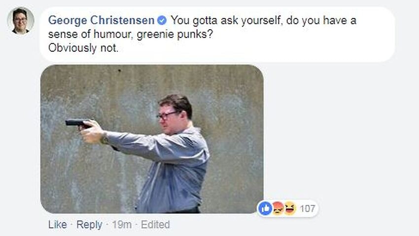 George christensen has received criticism across the political spectrum for posting this photo to facebook on saturday with the caption: george christensen. Over the weekend, nationals mp george christensen posted an image of himself cheerfully firing a gun on his public facebook page—a very sensitive thing to do, i think we can all agree, in the.